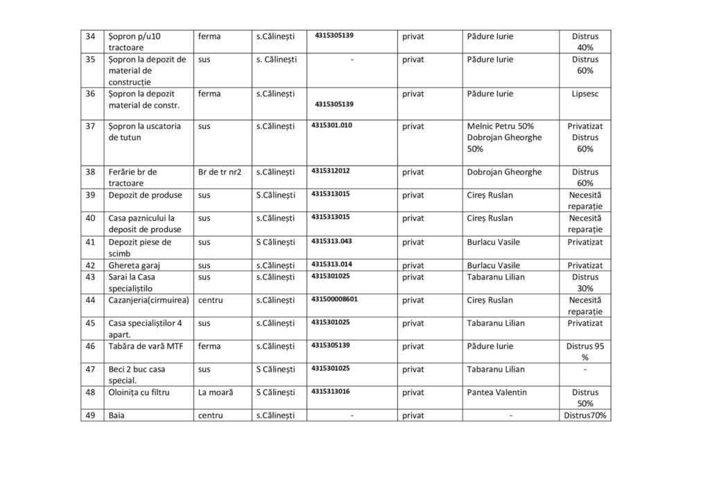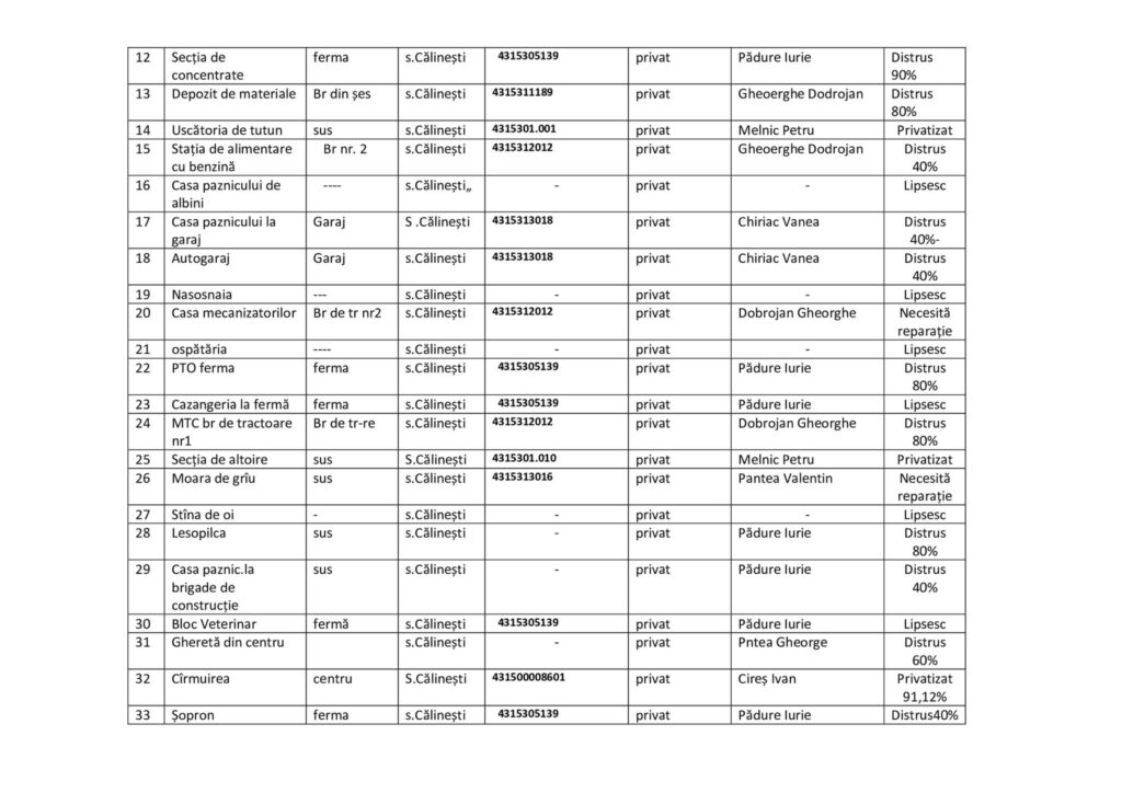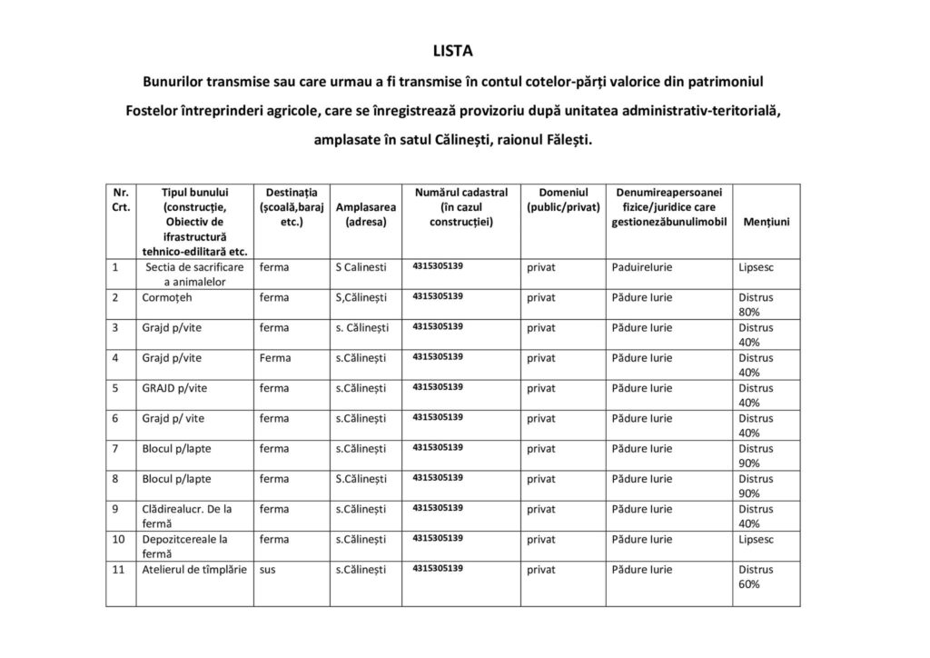 În conformitate cu Legea nr.133/2011 privind protecția datelor cu caracter personal, asigurăm accesul la listele bunurilor prin afișarea acestora pe contul de Facebook şi pagina WEB a Primăriei. Până la data de 10 septembrie 2023 când vor avea loc audieri publice, mă adresez către Dumneavoastră să studiaţi lista de mai jos, ca în ziua audierilor să aveţi propuneri, sugestii, opinii cu privire la cotele-părţi valorice din patrimoniul fostei Gospodării Agricole ,,Grănicerul”.