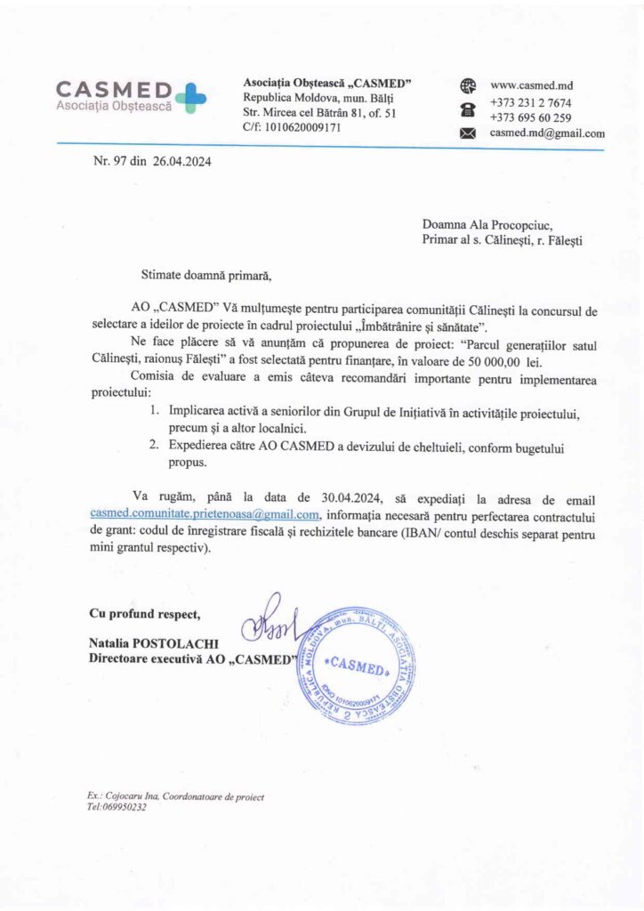 Cu mare drag Vă anunț, că propunerea de proiect ,,Parcul generațiilor satul Călinești, raionul Fălești” a fost selectată pentru finanțare!