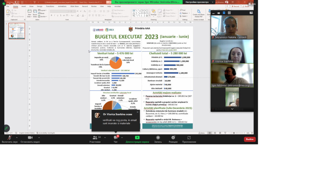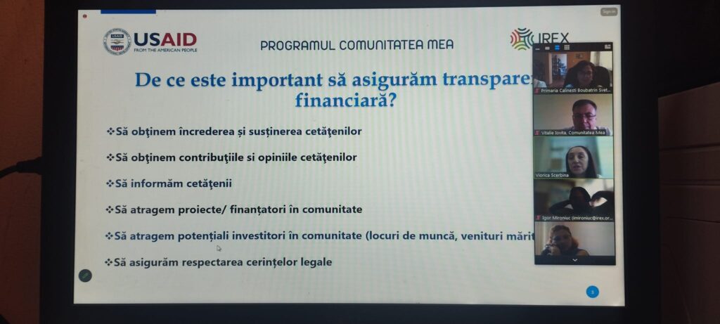 La data de 10 August 2023 am avut norocul să fim instruiți online de către domnii Vitalie Iovita , Igor Mironiuc și doamna Viorica Scerbina, specialiști din cadrul Programul Comunitatea Mea. Dumnealor au redat într-un stil tacticos în ce constă transparența bugetară și utilizarea infograficelor pentru prezentarea informației intr-un format mai pe întelesul cetățenilor.