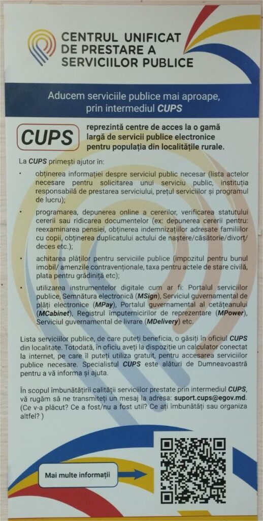 Serviciile publice electronice devin mai accesibile pentru oamenii de la sate și cetățenii moldoveni din diasporă, pentru care distanța, lipsa de informare sau resursele financiare reprezintă impedimente în solicitarea unui serviciu public. Acest lucru este posibil datorită lansării Centrelor Unificate de Prestare a Serviciilor Publice (CUPS).